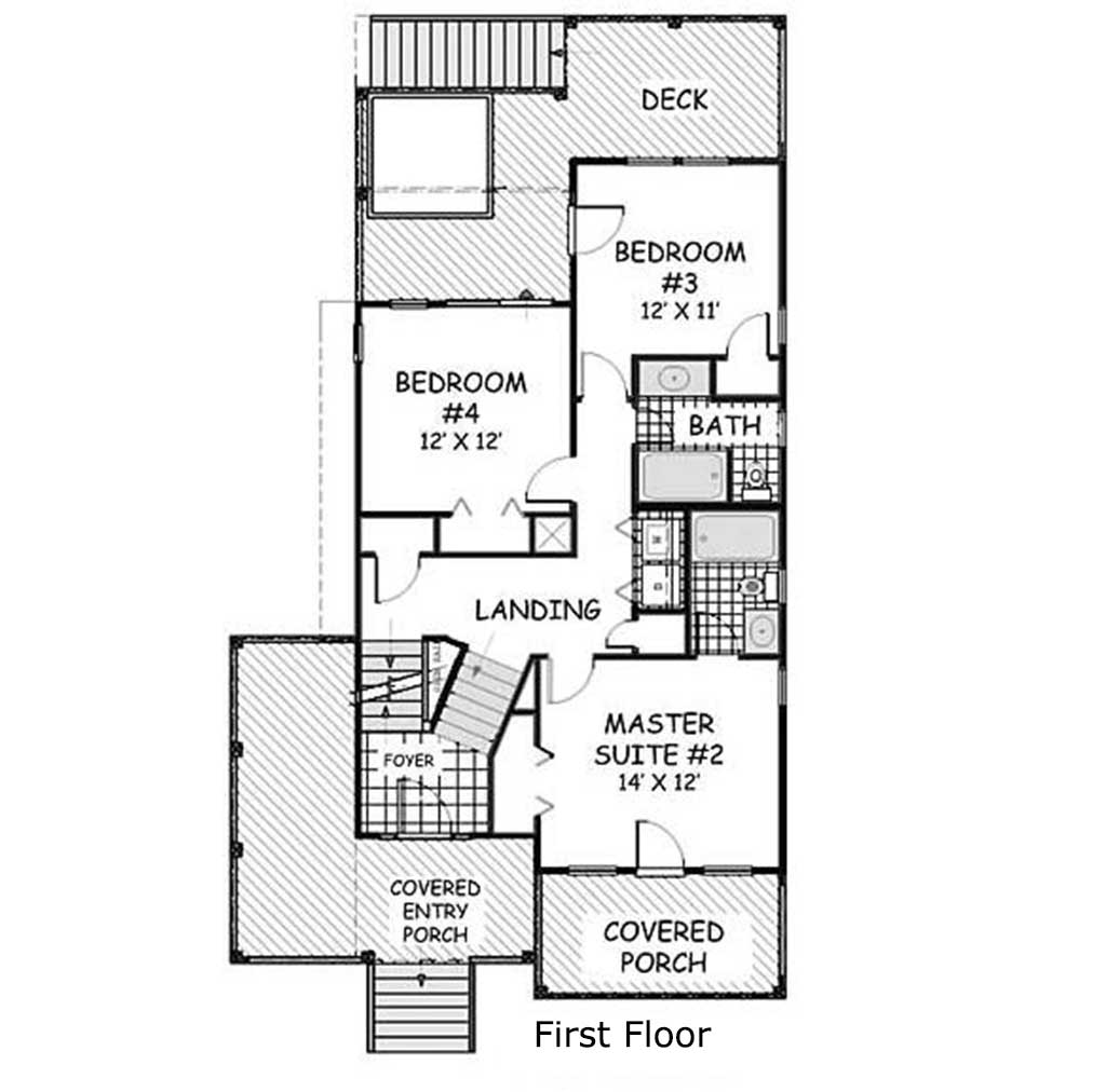 The Atlantic’s open floor plan and two master bedroom suites make it a popular choice in shore home designs. The kitchen features a center island and is open to the great room. A covered porch on the front of the home and a rear deck provide ample exterior living space.